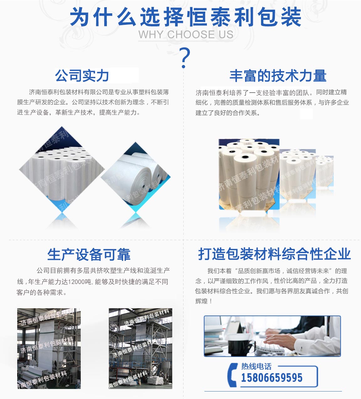 濟南恒泰利包裝材料有限公司位于濟南市市中區,是從事塑料包裝薄膜生產研發的企業。公司成立十幾年以來,堅持以技術創新為理念,不斷引進生產設備,革新生產技術,提高生產能力。并堅持自主創新,加強企業管理,培養了一支經驗豐富的團隊。同時企業建立高標準、精細化質量檢測管理體系和完善的售后服務體系,與國內外許多家企業建立了良好密切的合作關系。公司目前擁有多層共擠吹塑生產線和流延生產線,年生產能力達12000噸,能夠及時快捷的滿...